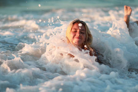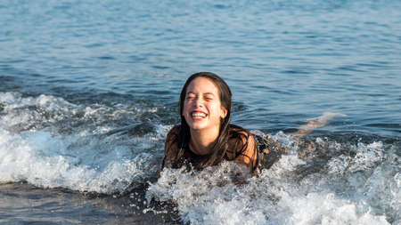 Beautiful emotional Model Girl making splash in the sea and laughing