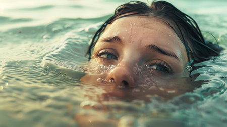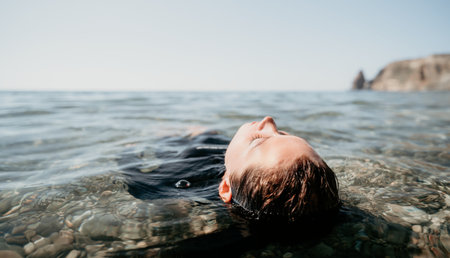 Serene Depths: A Peaceful Young Woman Immersed in Tranquil Sea Waters on a Sunny Day