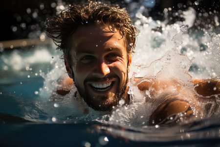 A man is floating in a pool of clear blue water, surrounded by tiles. He moves his arms and legs gracefully, propelling himself through the water. The ripples created by his movements reflect the sunlight.