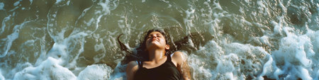 A serene young woman, eyes closed, floats effortlessly in calm water Dressed in a black top, she embraces the tranquility of nature, radiating peace and inner balance The beautiful outdoor setting enhances the feeling of calmness and serenity, inviting viewers to find their own moment of peace AI Generative