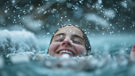A person emerging from the water with a triumphant smile surrounded by chunks of ice and snowflakes