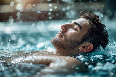 A calm young man with wet dark hair floats in blue water with his eyes closed while relaxing in a swimming pool or thermal bath surrounded by blurred figures in the background.