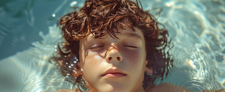 Close-up of young woman floating peacefully in swimming pool with sparkling water reflections and serene expression.