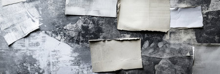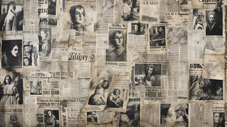 Vintage newspaper clippings overlap creating a textured collage on a weathered background. Generative AI
