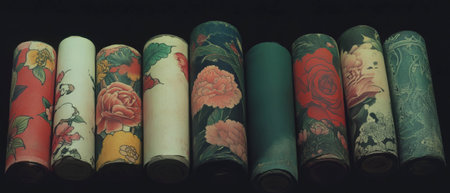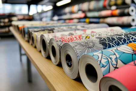 A vibrant assortment of rolled fabrics displayed on a wooden shelf, showcasing various patterns and textures, perfect for crafting, sewing, and decor projects.