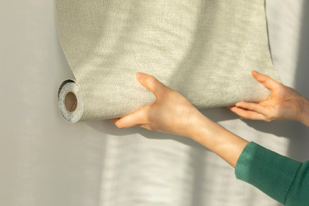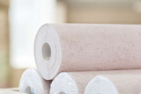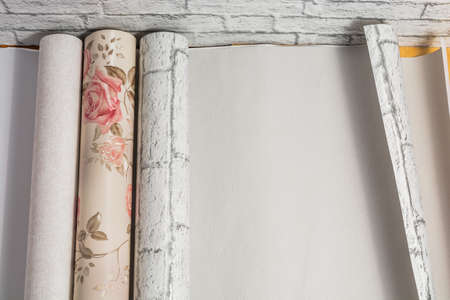 Three rolls of wallpaper are spread out on the floor. Apartment renovation concept. We make repairs ourselves.