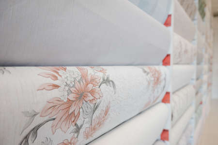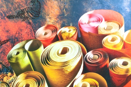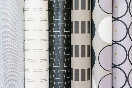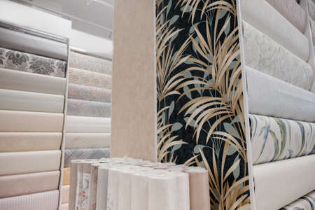 Wallpaper shop.A large assortment of wallpapers of different colors and shadesSamples of different wallpapers on store window racks