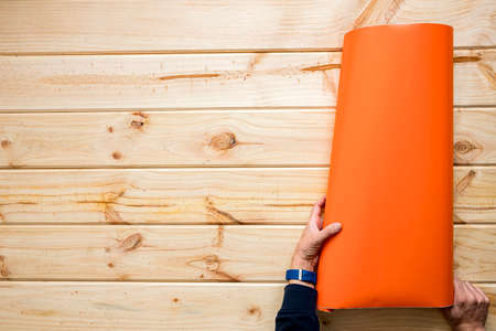 Rolled up roll of beige linoleum with wood texture on white wood floor. Home renovation and improvement.