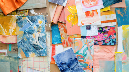 Fashionable background with a collage of torn paper from magazines, variety of patterns. Pastel colours. Generative AI.