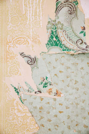 Vintage, old wallpaper, dripping paint, layers of different colorful paper backgrounds.