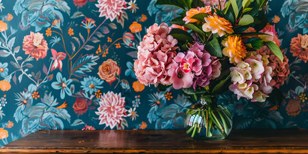 Vibrant wallpaper backdrop enhances the beauty of a bright floral arrangement on a wooden table. Concept Bright Floral Arrangements, Wooden Table, Vibrant Wallpaper Backdrop, Beauty Enhancement