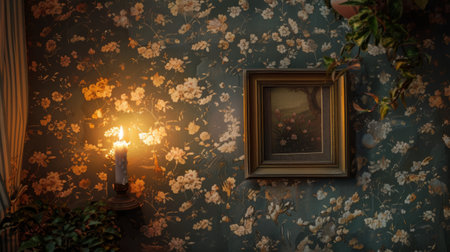 Warm Candlelight Casts Ambiance on Floral Wallpaper and Framed Art in Cozy Room