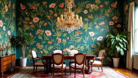 Elegant dining room with floral wallpaper and chandelier in classic setting. That the image is generated using AI.