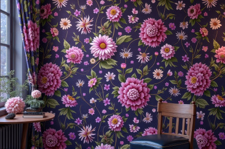 Vibrant floral wallpaper in cozy room with pink dahlias and wooden chair. That the image is generated using AI.