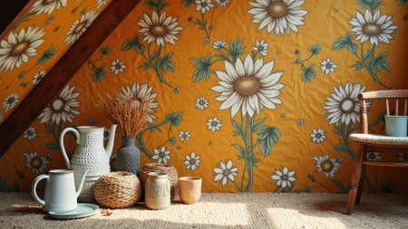 Cozy attic with sunflower wallpaper and rustic decor in natural light. That the image is generated using AI.
