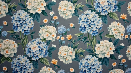 Elegant floral pattern with blue and white hydrangeas on gray background. That the image is generated using AI.
