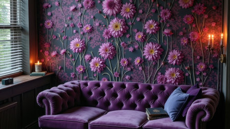 Luxurious living room with purple sofa and floral wallpaper in cozy ambient light. That the image is generated using AI.