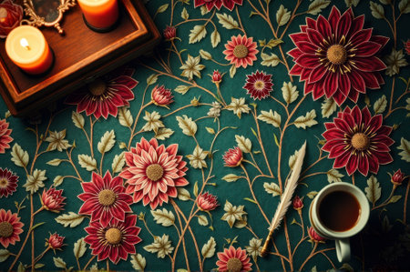 Vintage floral pattern with candles, quill, and teacup on ornate surface. That the image is generated using AI.