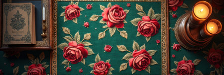 Vintage floral pattern with red roses and candlelit ambiance on green fabric. That the image is generated using AI.