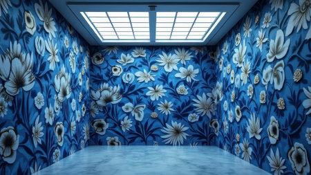 Elegant blue floral pattern room with marble floor and skylight. That the image is generated using AI.