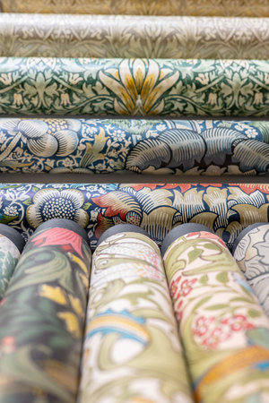 Rolls of wallpapers on display in a store