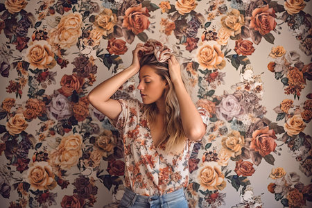 a woman standing in front of a floral wallpaper with her hands on her head and looking at the camera. Generative Ai