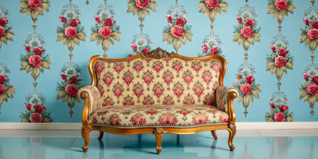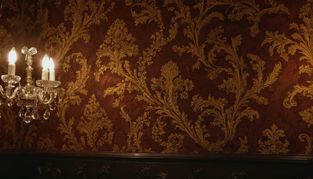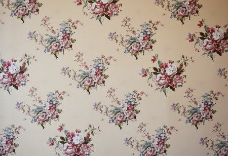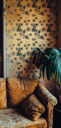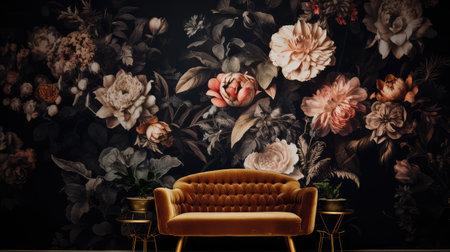 Interior room with vintage baroque floral wallpaper, combining opulent floral patterns with refined design.