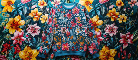 An intricate patterned crewneck mockup set against a vibrant floral background, appealing to those who love bold and colorful fashion, --ar 16:7 --v 6 Job ID: 16def77b-6b20-4b3d-9183-2cf18bb01a73