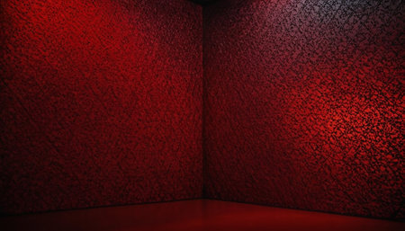 A close-up of a textured red surface with floral patterns, transitioning from dark silhouettes to gold highlights under dramatic lighting, creating a warm, inviting mood.