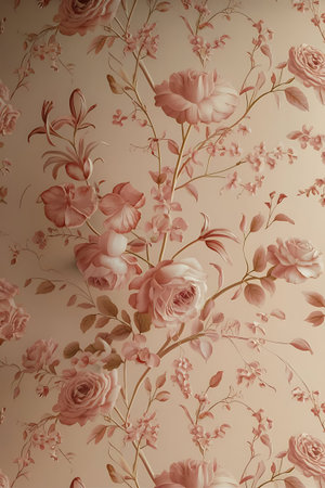 A close-up of a wallpaper featuring a pattern of pink roses, leaves, and stems, creating a vintage and romantic aesthetic.