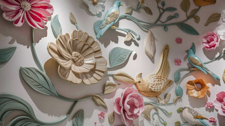 3D illustration of a wall mural. Refined and elegant floral details with a harmonious blend of classic and modern elements. AI generated.
