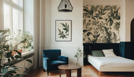Minimalist modern bedroom with botanical wallpaper and dark blue velvet accent decor