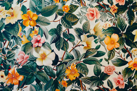 A colorful floral print with a variety of flowers and leaves. The image has a bright and cheerful mood, with the colors and patterns creating a sense of happiness and positivity