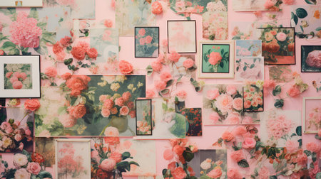 Assorted empty picture frames with decorative flowers and photos on light background. That the image is generated using AI.