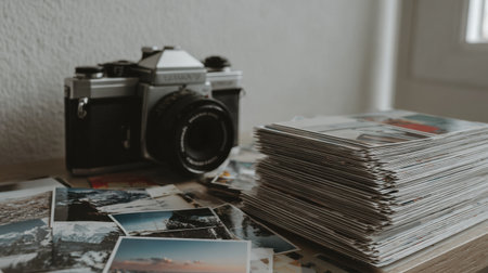 A classic film camera is positioned next to a tall stack of vintage photographs on a wooden table, providing a nostalgic atmosphere in a cozy room.