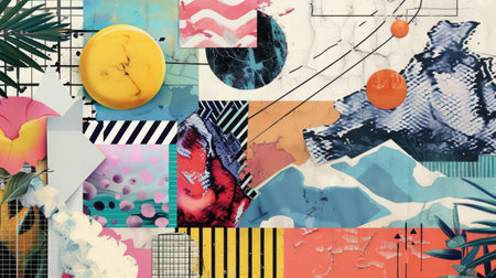 Minimalistic collage art blending warm and cool colors with diverse textures from magazines
