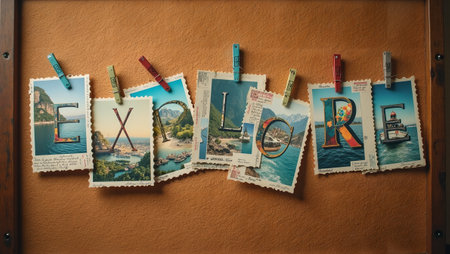 Vintage corkboard with explore spelled out in travel postcards and stamps evoking adventure