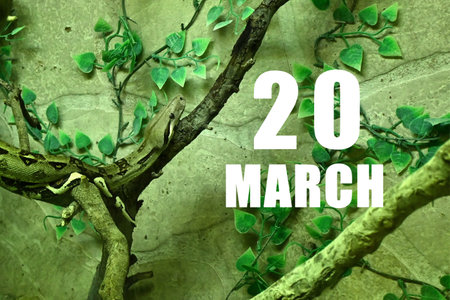 Calendar date on light green background with snake crawling on tree branch. March 20 is the twentieth day of the month.