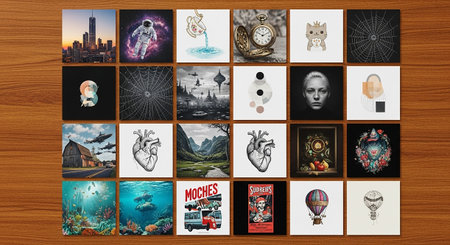 A grid of 25 square is arranged on a warm, textured wooden surface. The collection is highly diverse, featuring a wide array of and artistic styles. This includes realistic of cityscapes, astronauts, and natural landscapes, alongside of hearts, animals, and abstract The eclectic mix offers a broad visual spectrum, from scientific and technological themes to artistic and whimsical creations, making it a visually engaging and varied display.