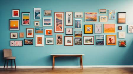 Coastal landscape art gallery wall with elegant framed seascapes and floral arrangement. That the image is generated using AI.