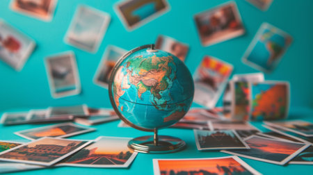 Travel photographs are scattered across a cobblestone sidewalk, capturing landmarks and scenic views during a warm evening. The soft light adds a nostalgic ambiance.