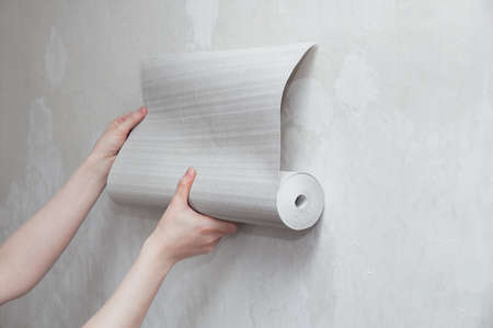 A roll of gray wallpaper in the hands of a Caucasian woman. Attaches wallpaper to the wall.