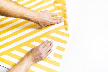 Hands of a man peeling off adhesive foil with yellow stripes.