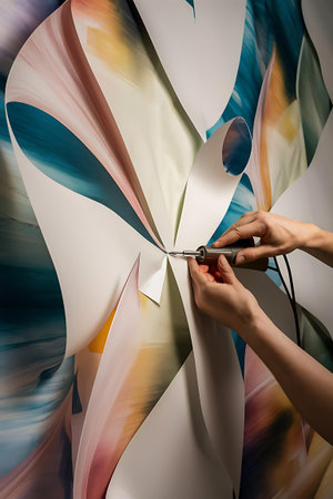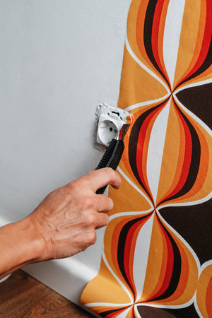 a caucasian man uses a box cutter to cut the edges of a geometric patterned wallpaper around a socket on the wall