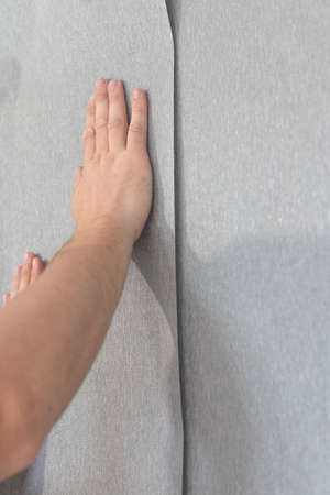 A man glues vinyl wallpaper on the wall, repair in the room and wallpapering, gray wallpaper.