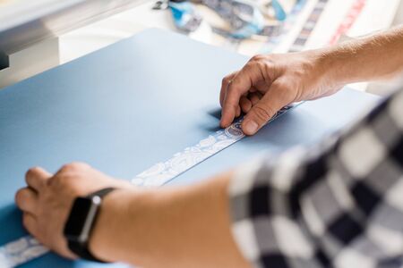 Hands of young master putting pet collar workpiece on special equipment to print ornament while working at home