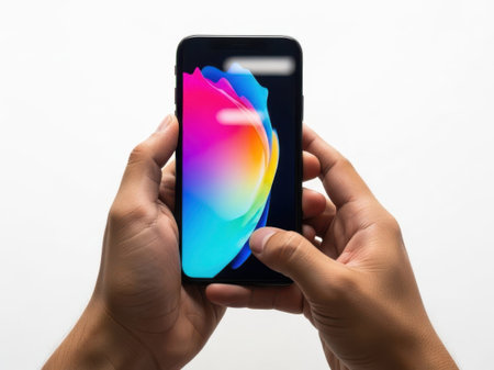 The image depicts a pair of hands holding a sleek, modern smartphone. The phone features a large, vibrant screen displaying a gradient of colors transitioning from blue to pink. The hands are positioned in a way that showcases the phone's design and screen clearly. The background is plain and white, ensuring the focus remains on the phone and the hands holding it. The overall image conveys a sense of modernity and technological advancement.