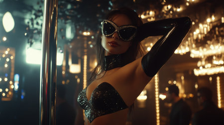 Woman in Cat Mask and Black Outfit Holding a Pole in a Dimly Lit Nightclub Environment. High quality photo