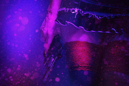 Attractive young woman in black lingerie sexy bending over lying topless against a wall of neon light