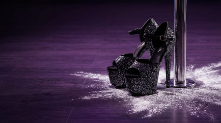 Heels of sexy woman pole dancing or striptease with pylon in night club. Stripper girl on shining background stage.